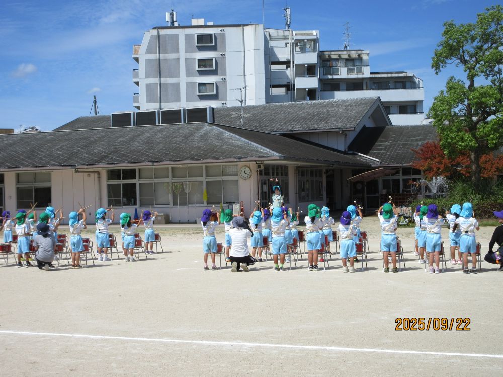 年長さんの鼓隊演奏は、憧れの的です。「せんせいみにい…