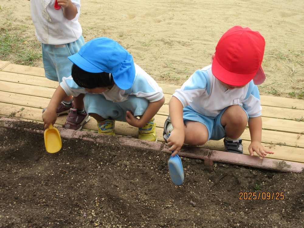 年少さんがミニ畑を一生懸命スコップで耕していました。栄…