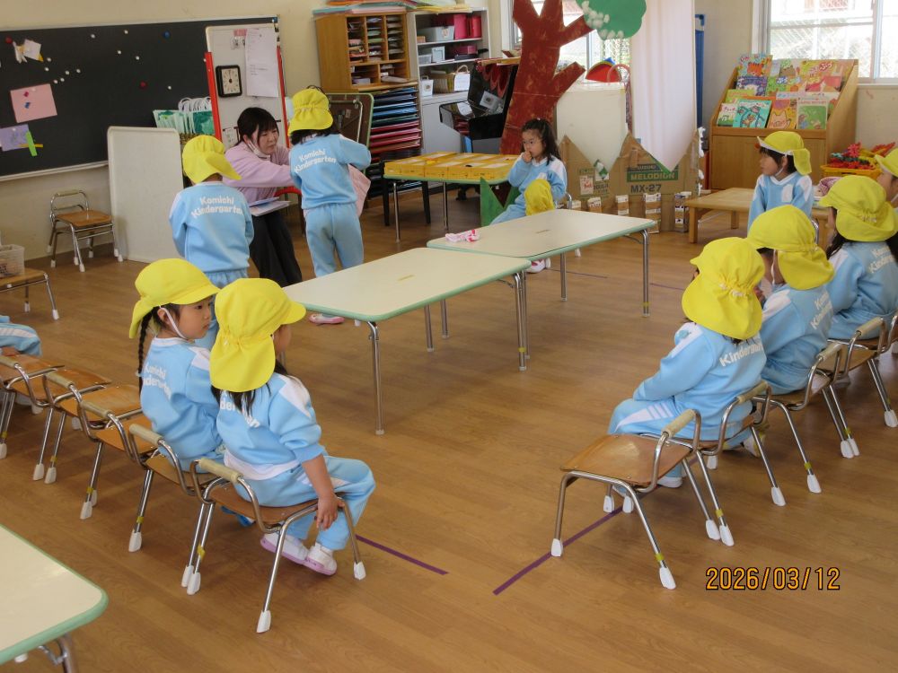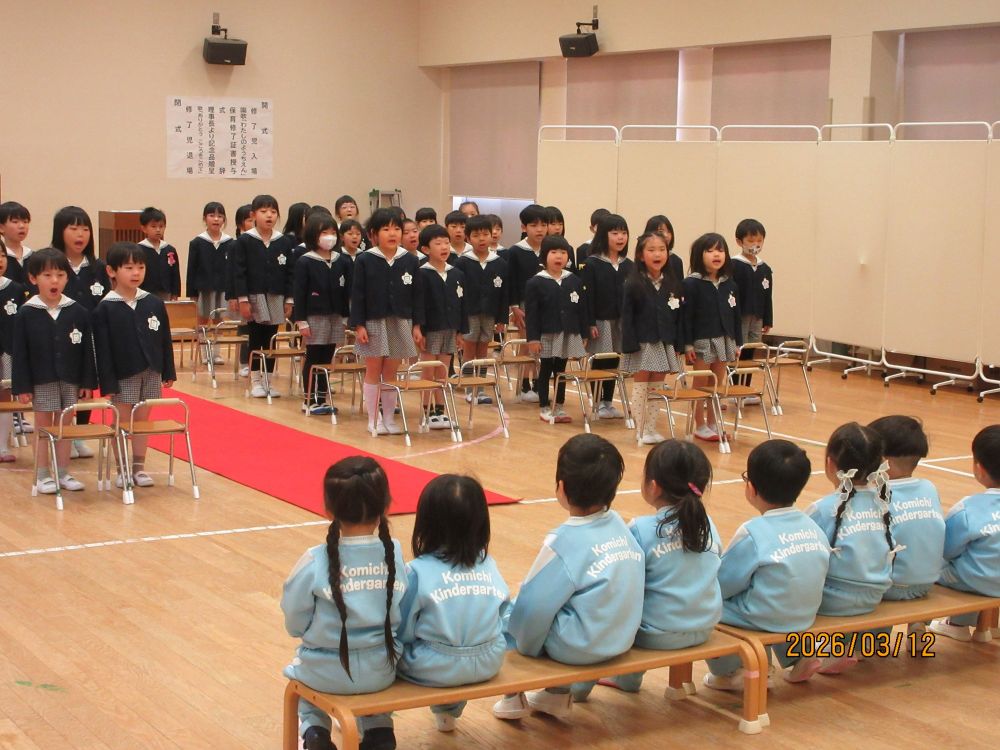 いよいよ明日は令和7年度保育修了証書授与式です。朝からバスを降りた途端「せんせい、〇〇ちゃんないてるよ~」と言う声が・・・見るとポロポロと涙を流しながら降りてきた〇〇ちゃん。「どうしたの~」と言うと、「さびしい~」と言いながら抱きついてきました。昨日年長の子ども達が全教職員に向けてお手紙を渡していました。「いままでありがとう」「こみちようちえん たのしかったよ」「3ねんかんおせわになりました」などの言葉が一生懸命書かれていました。一人ひとりの入園してきた頃のことを思い出しながら、練習の様子を見ました。「みんな大きくなったな~」と胸が熱くなりました。明日は本番!!一番輝く姿を見せてくれることでしょう。