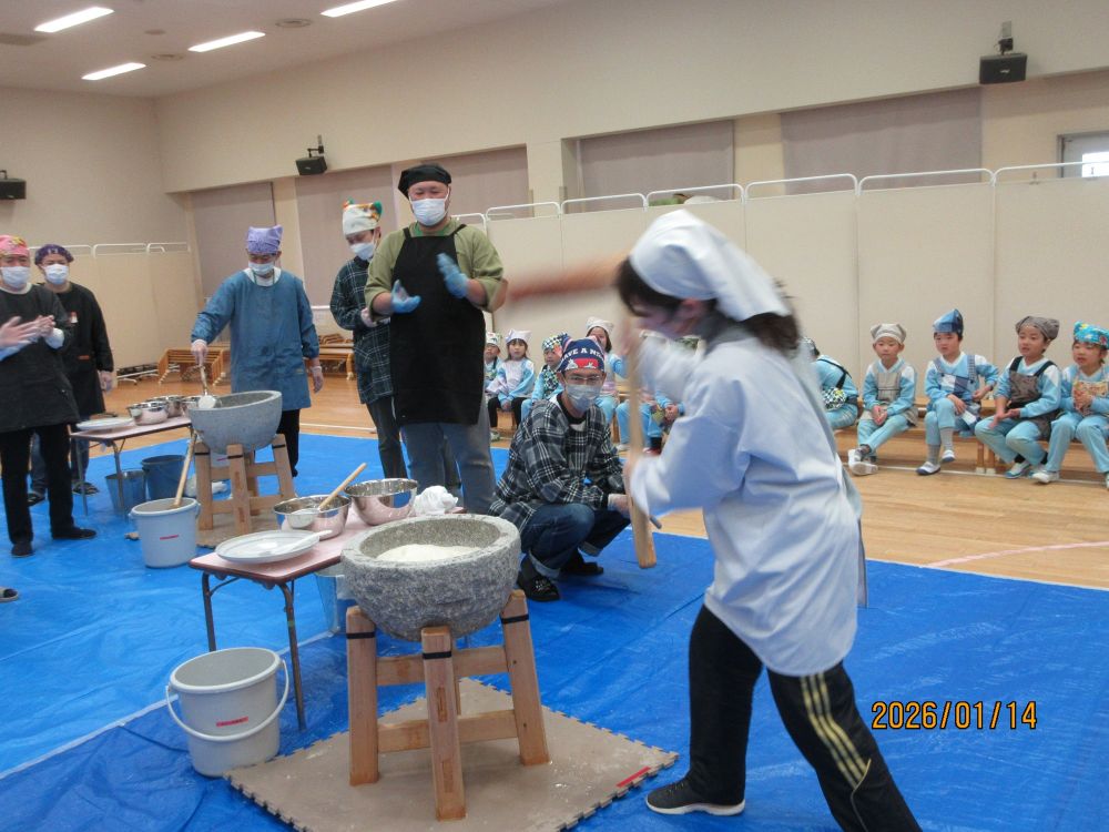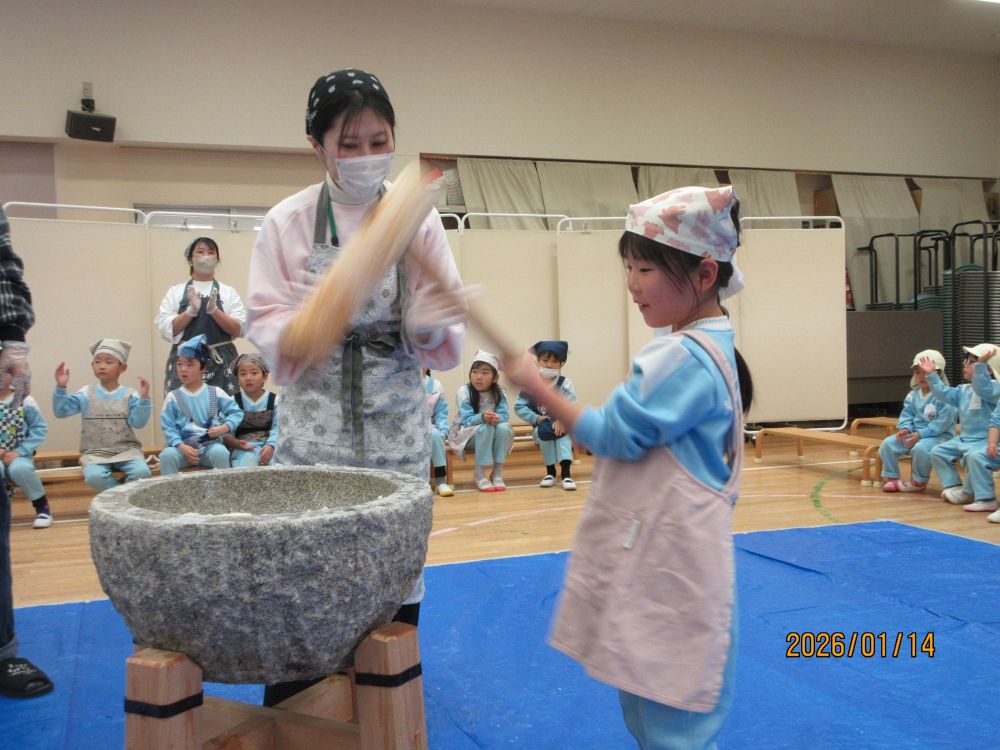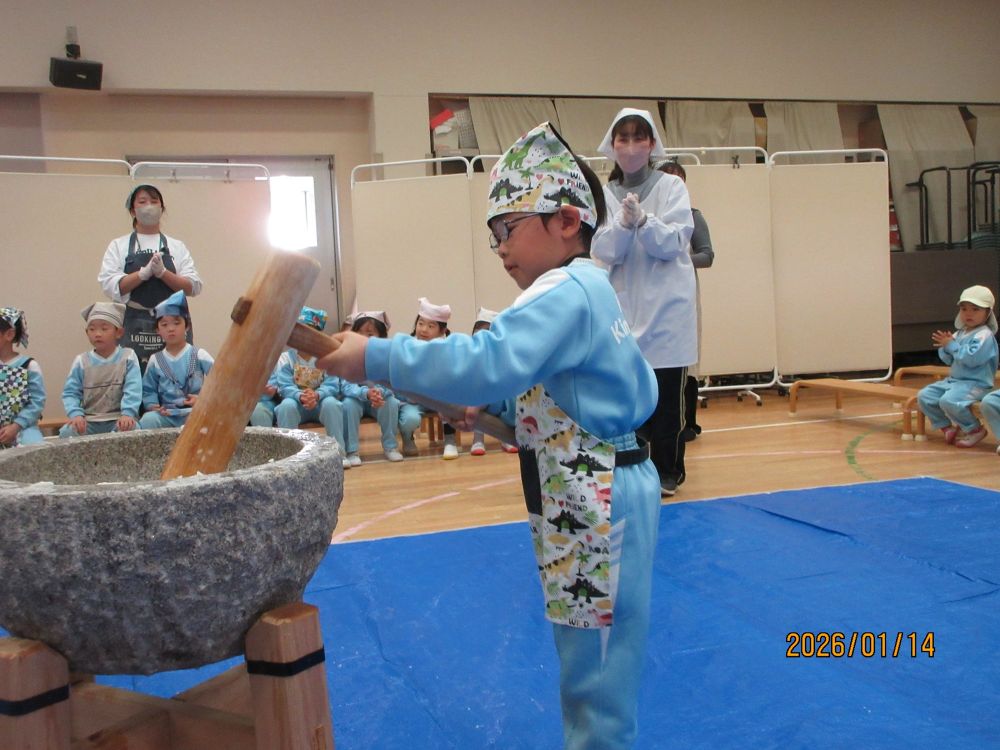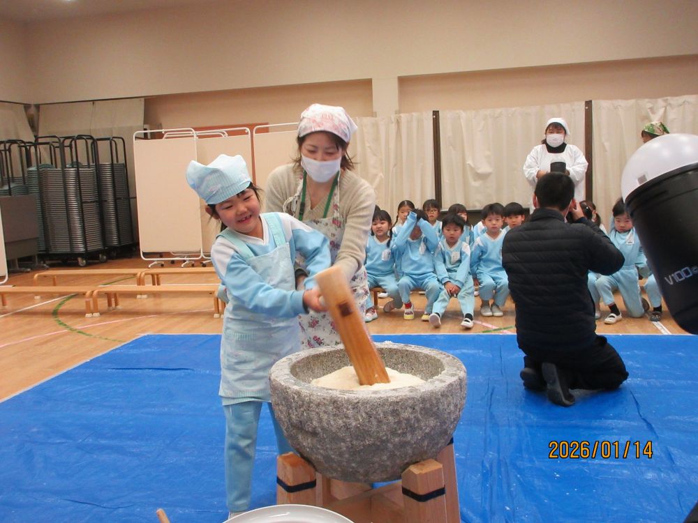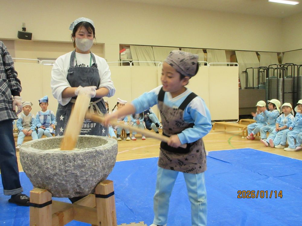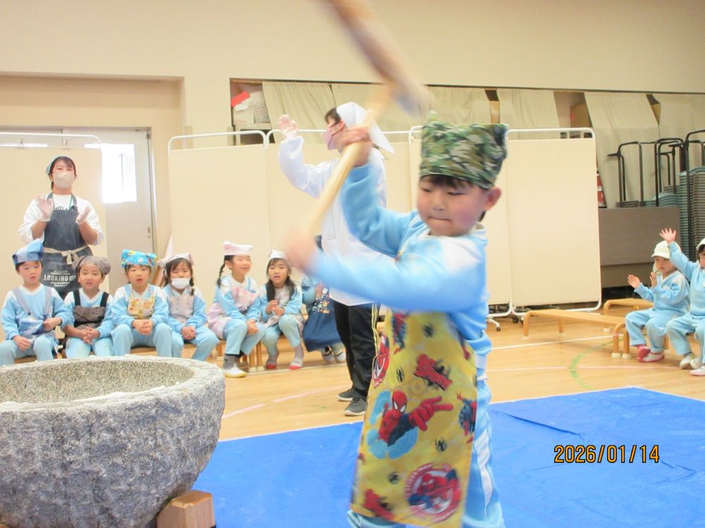14日(水)もちつきが行われました。今年もたくさんの保護者の皆さんに来ていただき、スムーズに終えることができました。登園してきた子ども達も、厨房から漂ってくる匂いに「せんせい なんかおいしそうなにおいがするよ~。」「きょうはおもちつきだね。」と口々にとっても楽しみにしていました。遊戯室に運ばれてきた熱々のご飯を口の中に入れて「もぐもぐ・・・」すると!!「せんせい!!おもちになってきたよ」保護者の皆さんや運転手さんが力いっぱいつく様子を「よいしょ!よいしょ!!」と応援していると、だんだんおもちがのび~~~て子ども達も大興奮!そして、いよいよ年長さんの出番です。重い杵にフラフラになる子どももいましたが、頑張って10回ずつつきました。最後には年長さんの担任の出番!子ども達よりも重い大人用の杵を持って!10回!と思いきや!!いやいやプラス20回頑張りましたよ~とってもおいしいおもちになりました。各保育室では、保護者の方が小さく丸めてくださったおもちを砂糖醤油と海苔でいただきました。おいしいおもちに何度も「おかわり!!」のどにつめるといけないから・・・とおもちつきの行事そのものの実施を控える傾向があるようですが、本園では経験してほしい大切な行事としてとらえています。