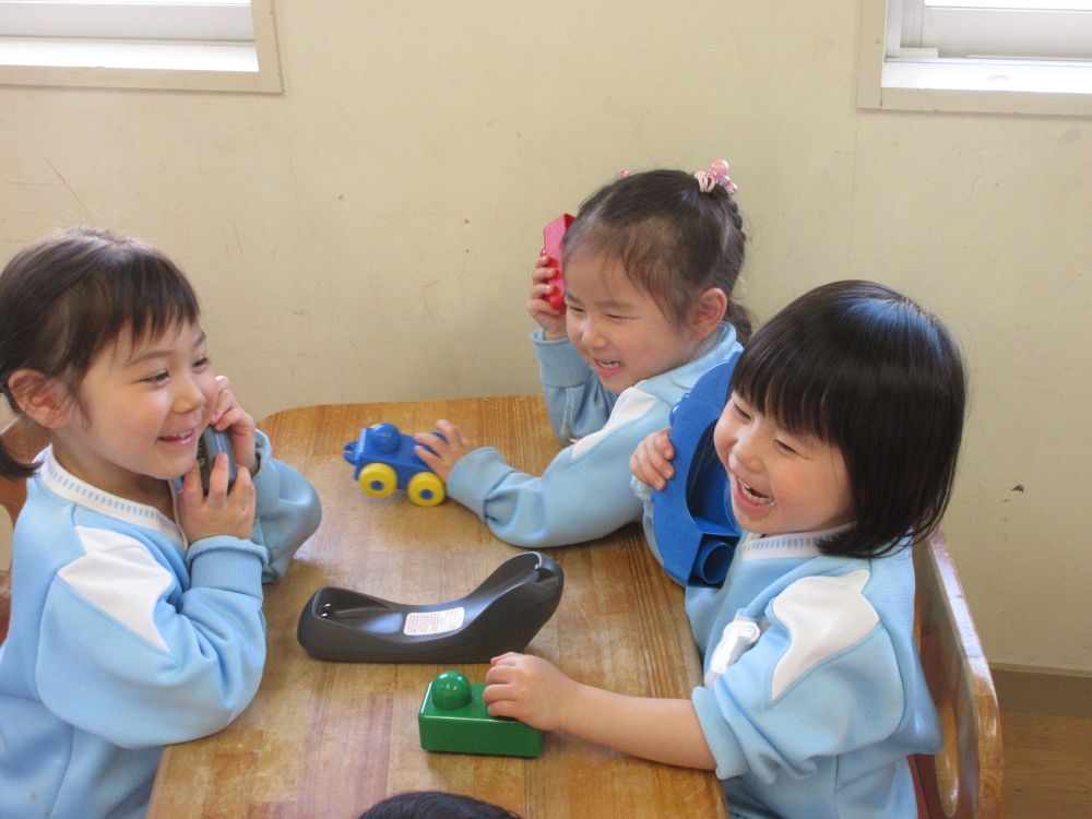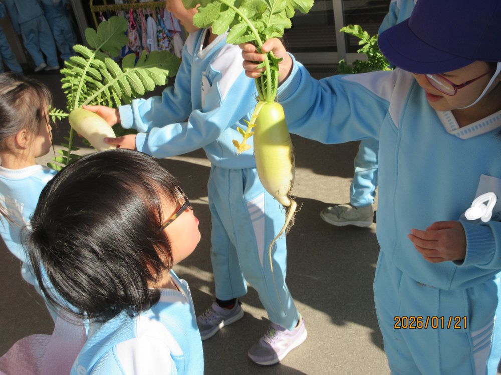 年長さんが畑でダイコンを収穫しました。大きなダイコンに「せんせい~」と嬉しそうに見せに来てくれました。一人一本ずつ持ち帰りました。手提げかばんを「だいこんがはいってるからおもいわ~」と重そうに抱えていました。