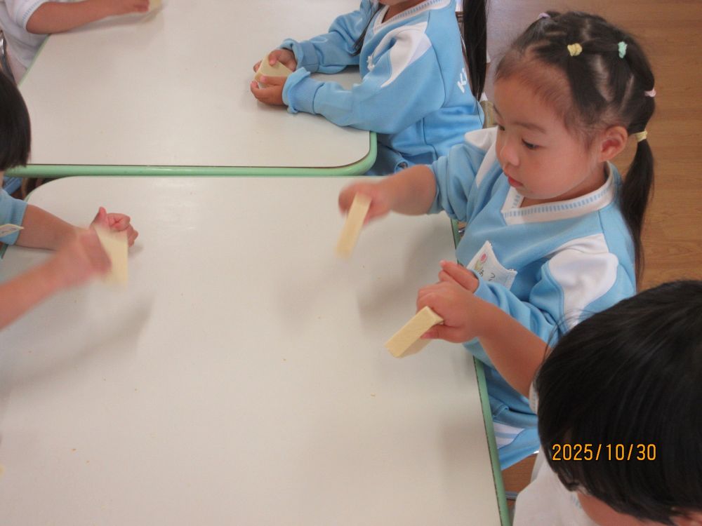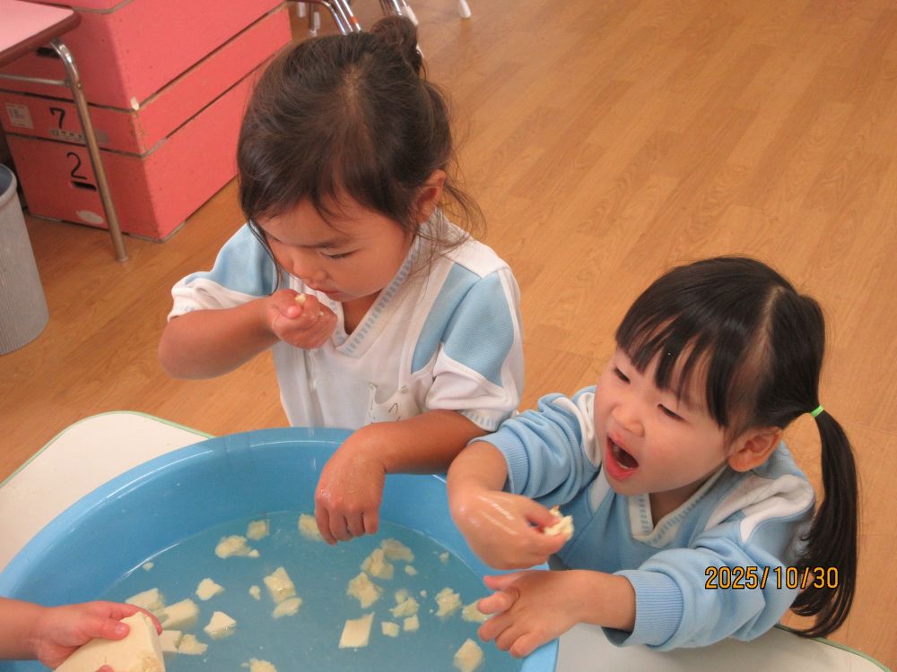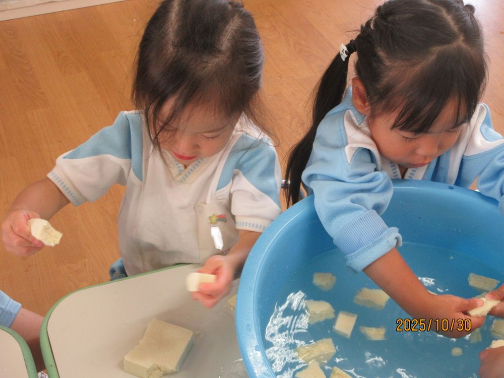 高野豆腐を使って遊びました。最初はカチカチだったけれど、お湯に浸けるとフワフワ柔らかくなってきました