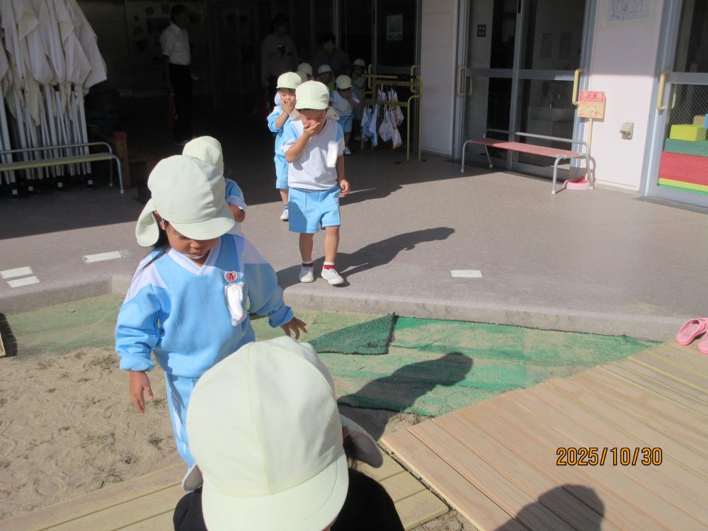 今日は午後から火災想定の避難訓練を行いました。非常ベルの音に少し驚いた様子でしたが、落ち着いて園庭に避難できました。