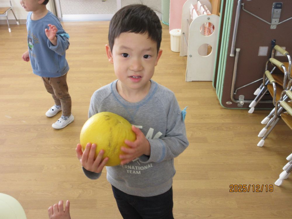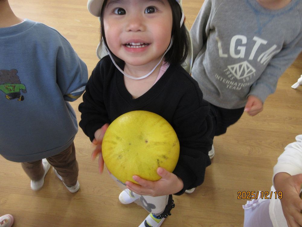 先日お散歩に行った時に、大きな実の木を見つけました。「あれはなんだろうね~。」と子ども達に聞いてみると、「みかんやで!」と言っていましたが、実は文旦(ブンタン)でした。「重いよ~」と声をかけてから子ども達に渡すと「かるいよ~。」と頭の上まで上げたり、「おもくない!」とみんなが、「もちたい!」と大騒ぎでした。「みかんのにおい!」「なんかくさい!」と感想は様々でした。