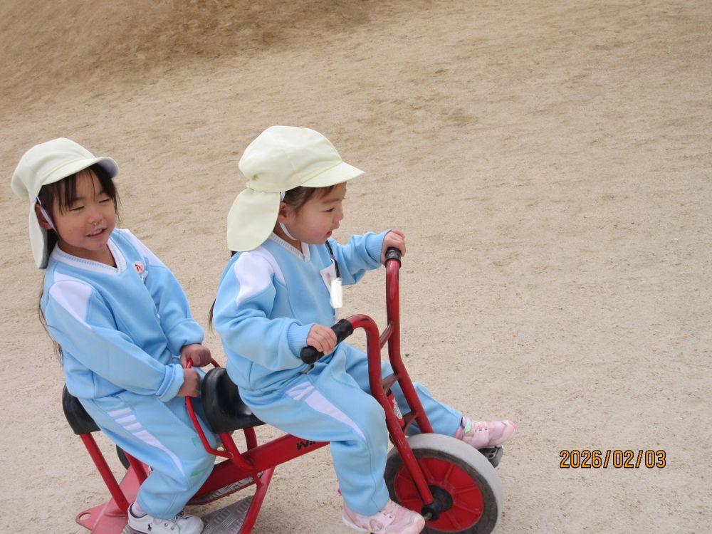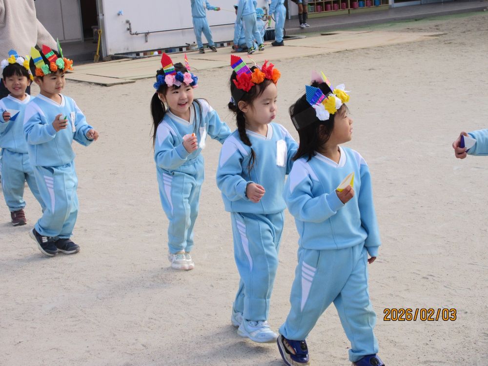 今日の園庭は、豆まきが終わるとつくし組さんの貸し切り状態!!先生を追いかけていっぱい走りました。最後には「園長先生をつかまえろ~」で園長先生のところまで走って走って!!!(園長先生も逃げて逃げて・・・)やっとつかまえた頃には「せんせい あつい~!」と身体も心もぽっかぽかでした。