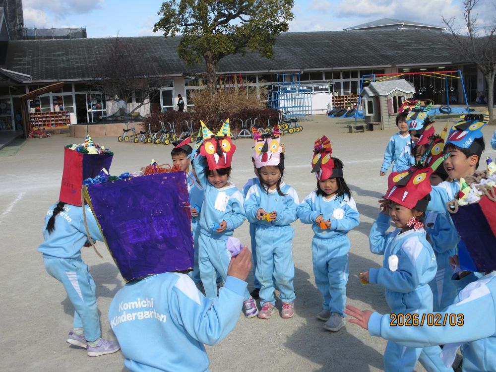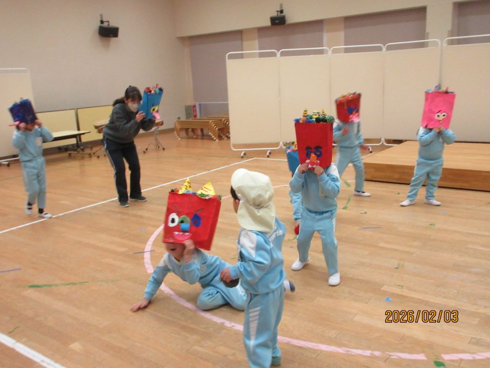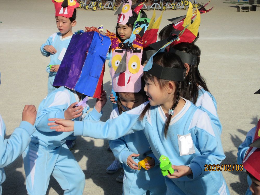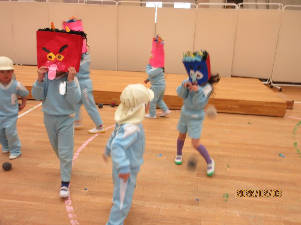 今日は節分です。幼稚園では、豆まきをしました。年長の子ども達は怖がらせる気持ち満々!!年少さんやつくし組の中には、怖くて泣き出したり、保育室から動けなかったりする子どももいましたが、何とか頑張って「おにはそと!!」と豆(つくし組は毛糸玉)を鬼に投げつけていました。今年も元気に過ごせますように・・・。