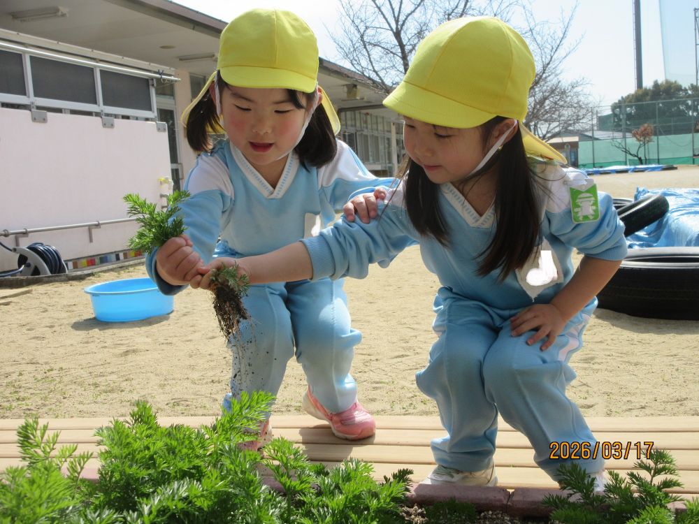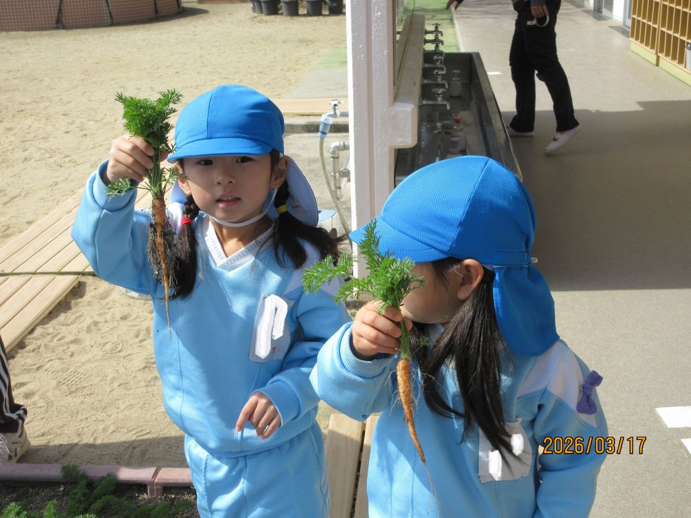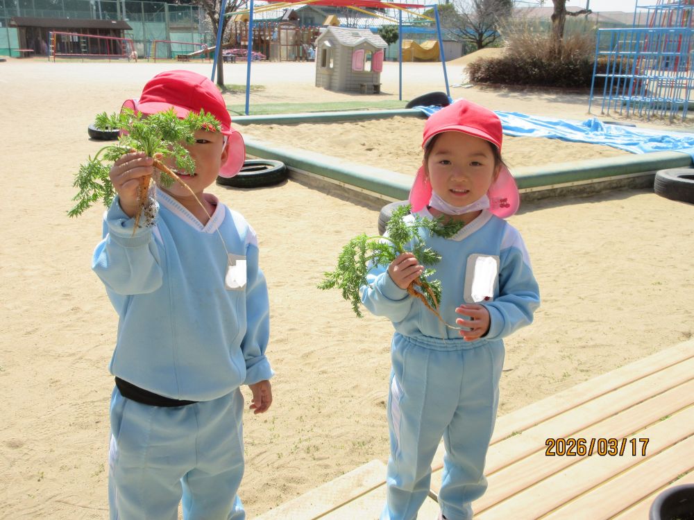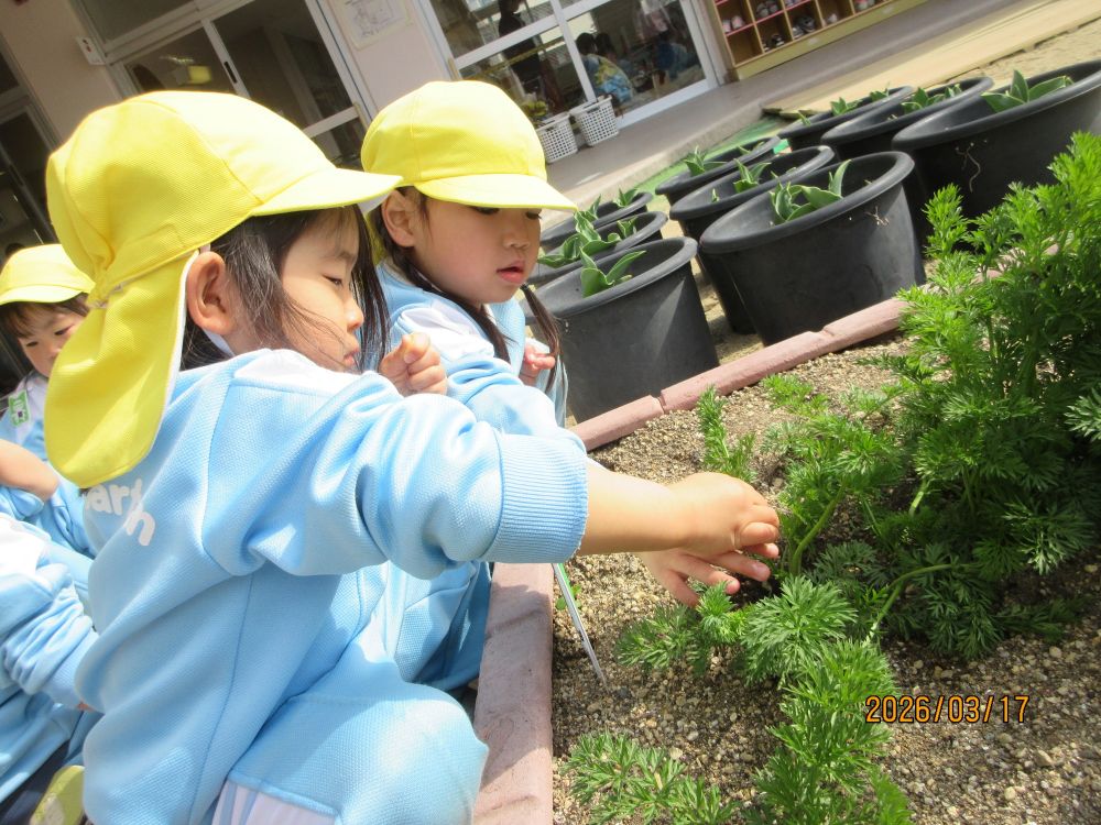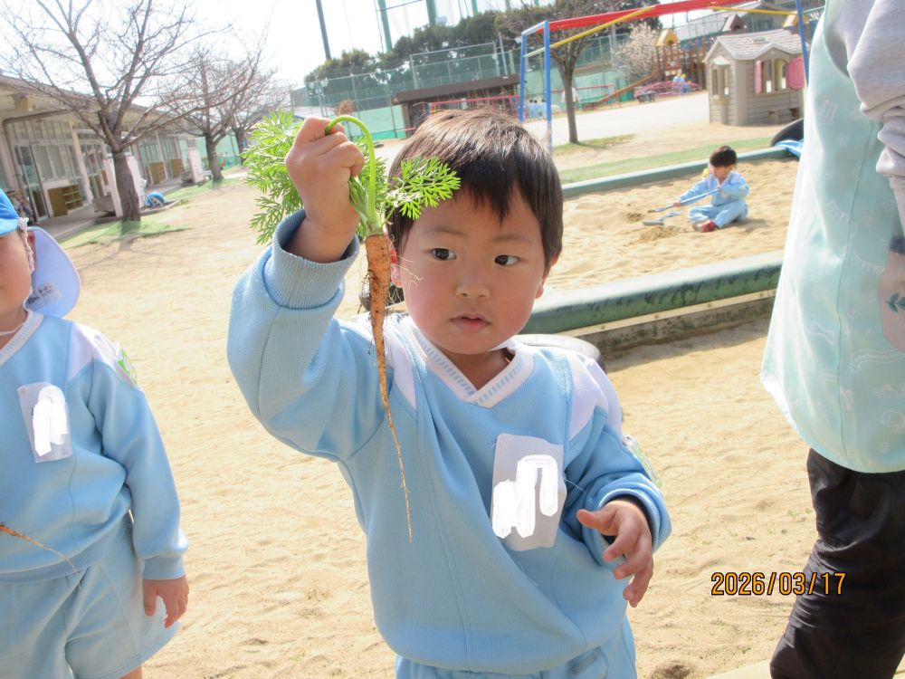 年少さんが、人参を収穫しました!!小さい小さい人参ですが、「せんせい とれた!!」「ミルクちゃんにあげよう。」「わたしはモルモットにあげる!」と大喜びです。