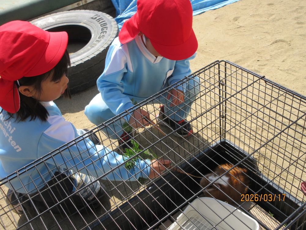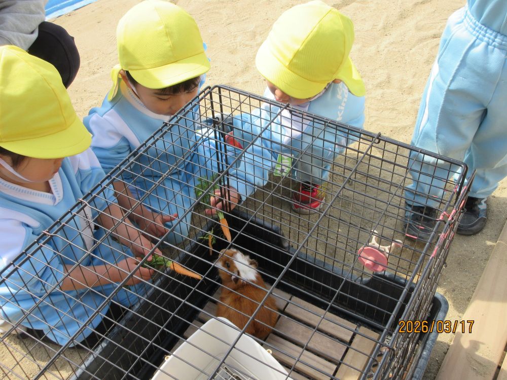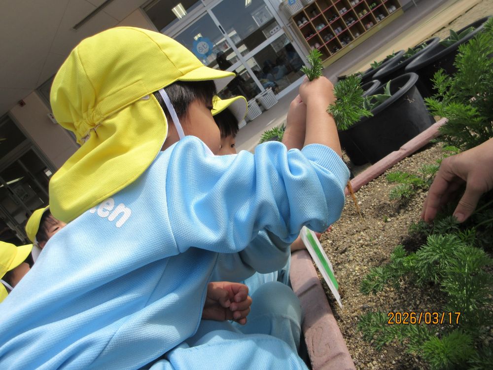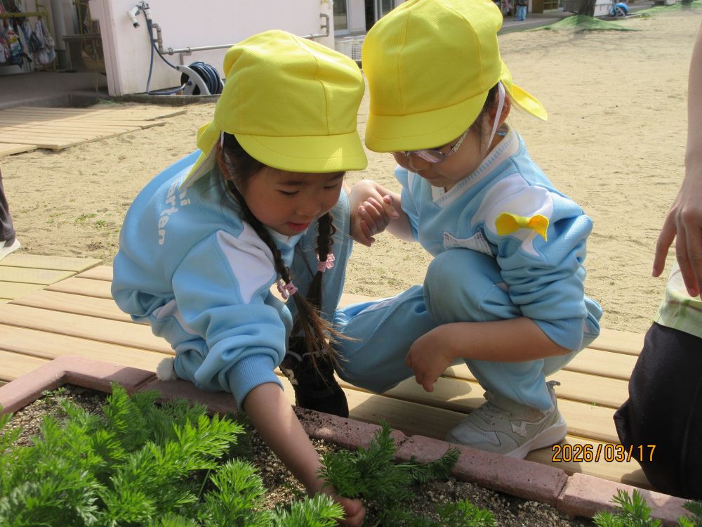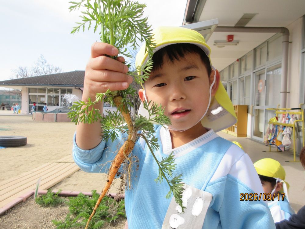 年少さんが、人参を収穫しました!!小さい小さい人参ですが、「せんせい とれた!!」「ミルクちゃんにあげよう。」「わたしはモルモットにあげる!」と大喜びです。
