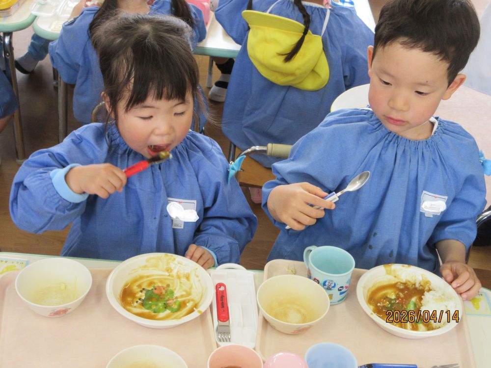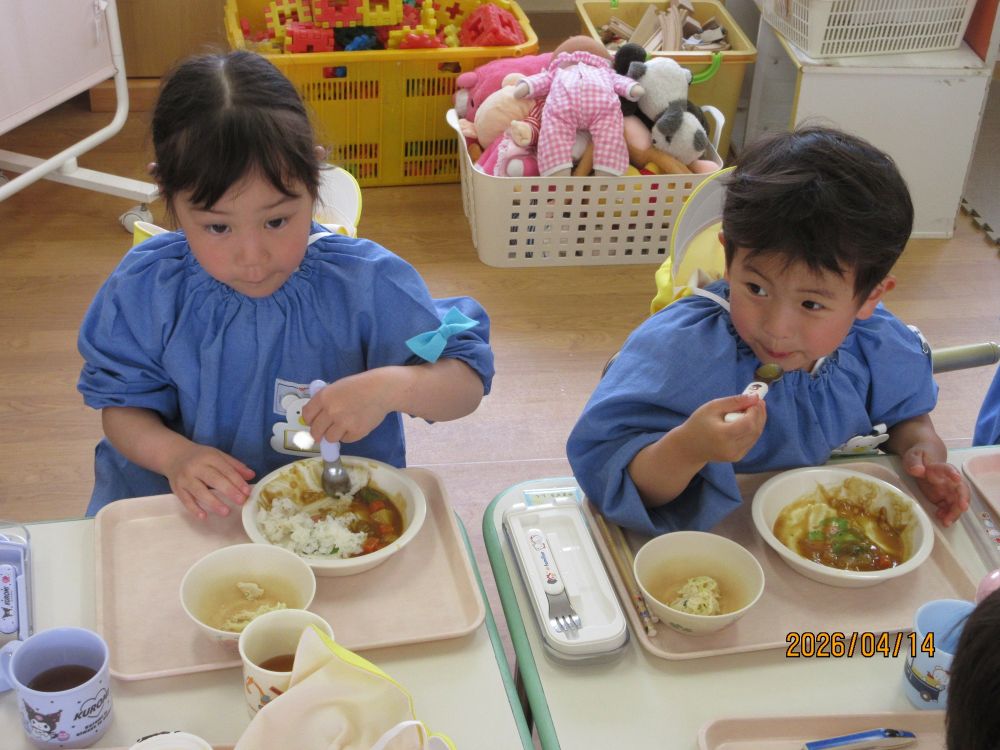 今日から全日保育が始まりました。昨日の降園時には、いきなり泣き出す子どもが続出!!「おうちの人に会いたくなったのかな?もうすぐ帰るからね。」となだめると、「もっとあそびたかった~😢」とのこと。汗びっしょりになって園庭で遊びました。年長さんは、クラスみんなで「ダンスホール」を踊ったり、リレーをしたりして楽しんでいました。おかげで、給食の時には「おかわり~」とカレーライスを何度もおかわりしていました。