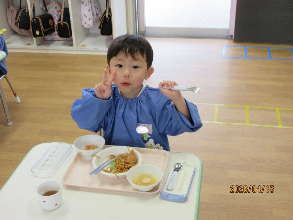 「おいしい!」「ようちえんのはおいしいね。」と大きな口でパクパク食べていました。食べ終わったらお皿の乗ったワゴンを給食室に運びます。「ごちそうさまでした!」「ありがとう!」ときちんと調理員さんにご挨拶しています。調理員さんからも「ありがとう!」と言ってもらえて子ども達も嬉しそうにしていました。
