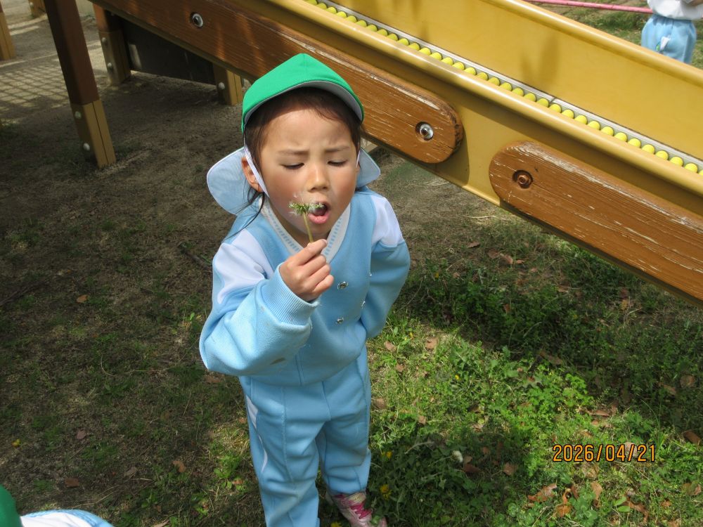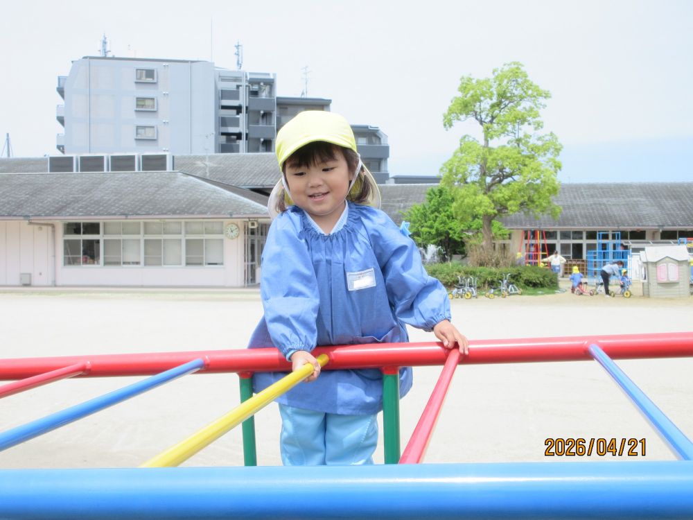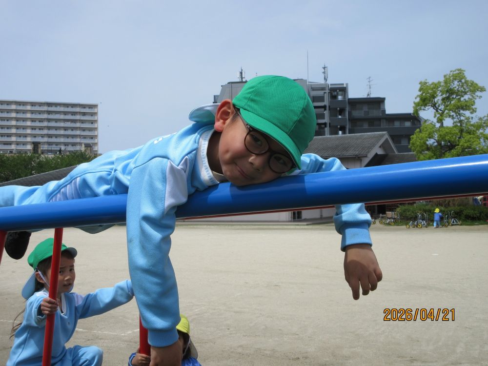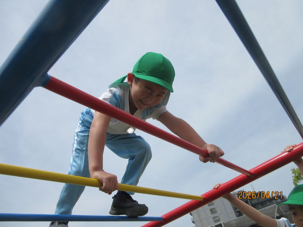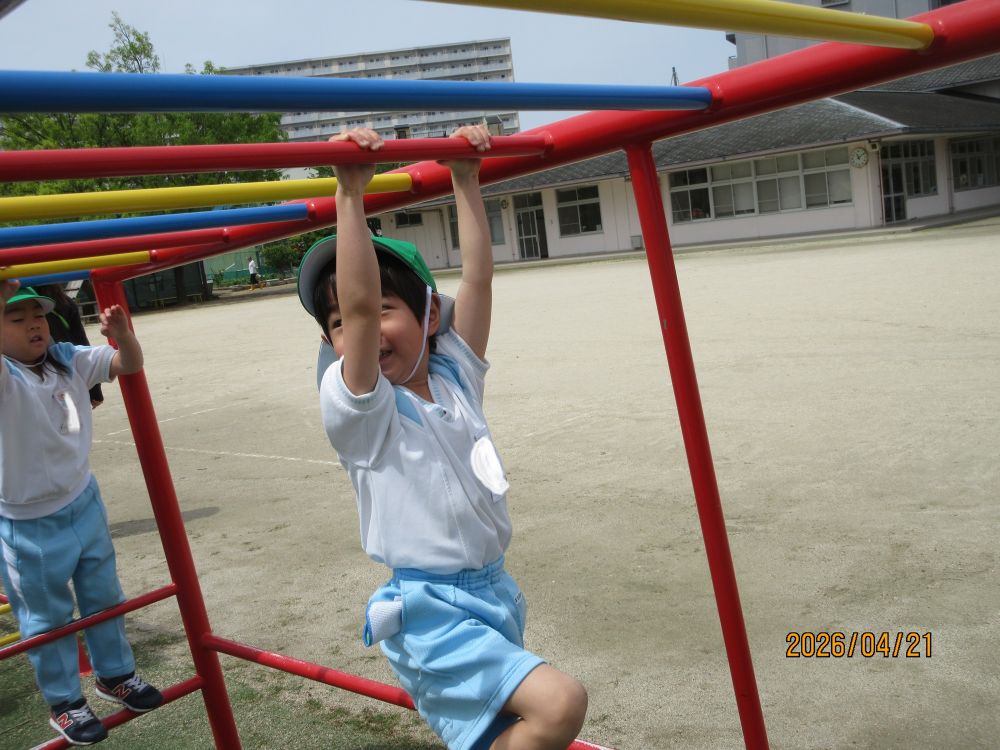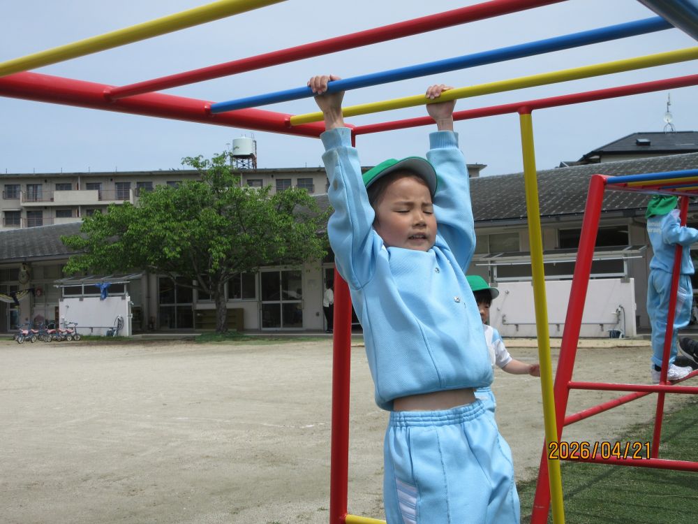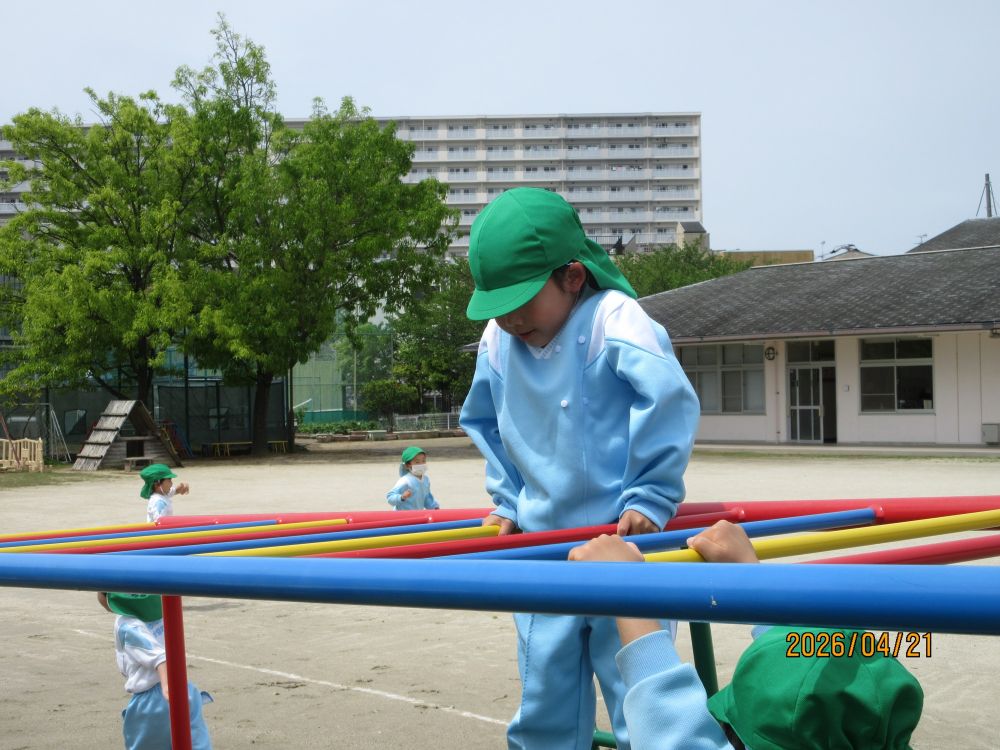 雨上がりの園庭・・・水たまりが少しありましたが、本園の園庭は水はけが良く、元気に子ども達が遊んでいました。土山にチャレンジする年少さんも、下りるのが少し怖くて、お尻をつけて滑り台のようにして下りるので、体操ズボンが・・・(お洗濯お手数おかけします!)年長さんが出てくると、一気に園庭は賑やかになります。大人が見ていると、「わ!!危ない!!」と思うようなこともへっちゃらです。「危ないからやめよう!」ではなく、「どうすれば怪我をしないか?」をしっかりと考え、子ども達の「チャレンジ精神」「やりたい!」の気持ちを大事にしたいですね。