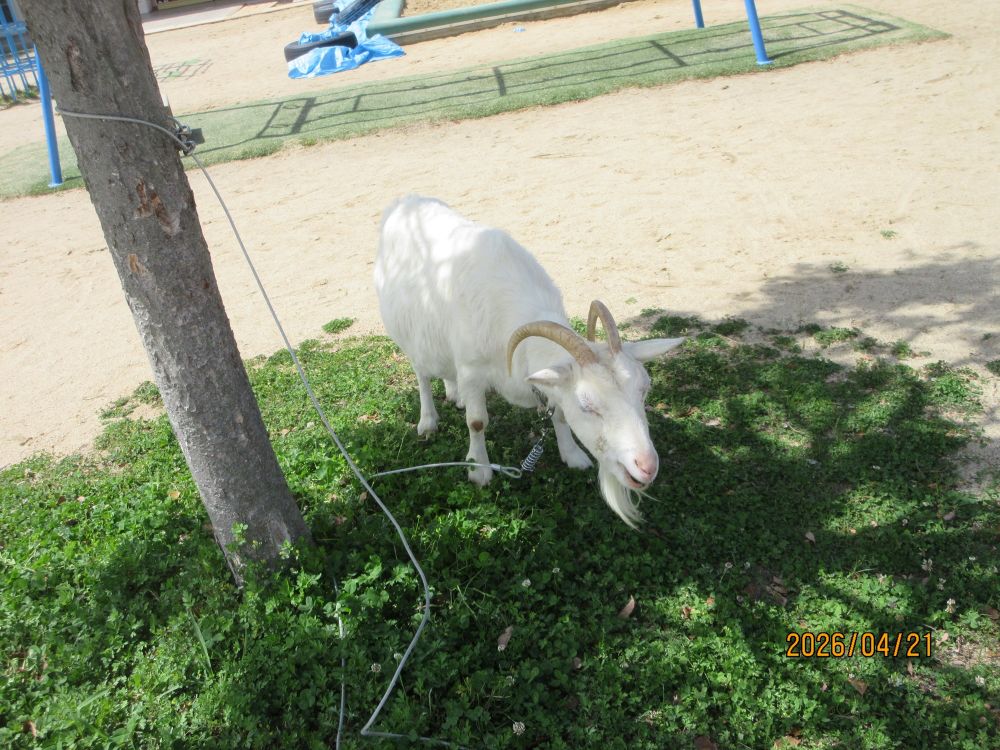 事件発生です!!S先生が「〇〇先生、ミルクちゃんタイヤにつなぎました???」と聞いてきたので、「うん!タイヤにつないでるよ~。」と答えると、何と!園庭を思い切り横断し、大移動!草を食べに来ていました。重いタイヤだったのですが、ミルクちゃんには筋力トレーニングくらいのものだったのでしょうか?しっかりと、園庭にタイヤをひきずった跡がついていました。そして立ち寄ったところ数か所におきまりのコロコロう〇ち・・・。食欲旺盛のミルクちゃんです。いつまでも元気でね。