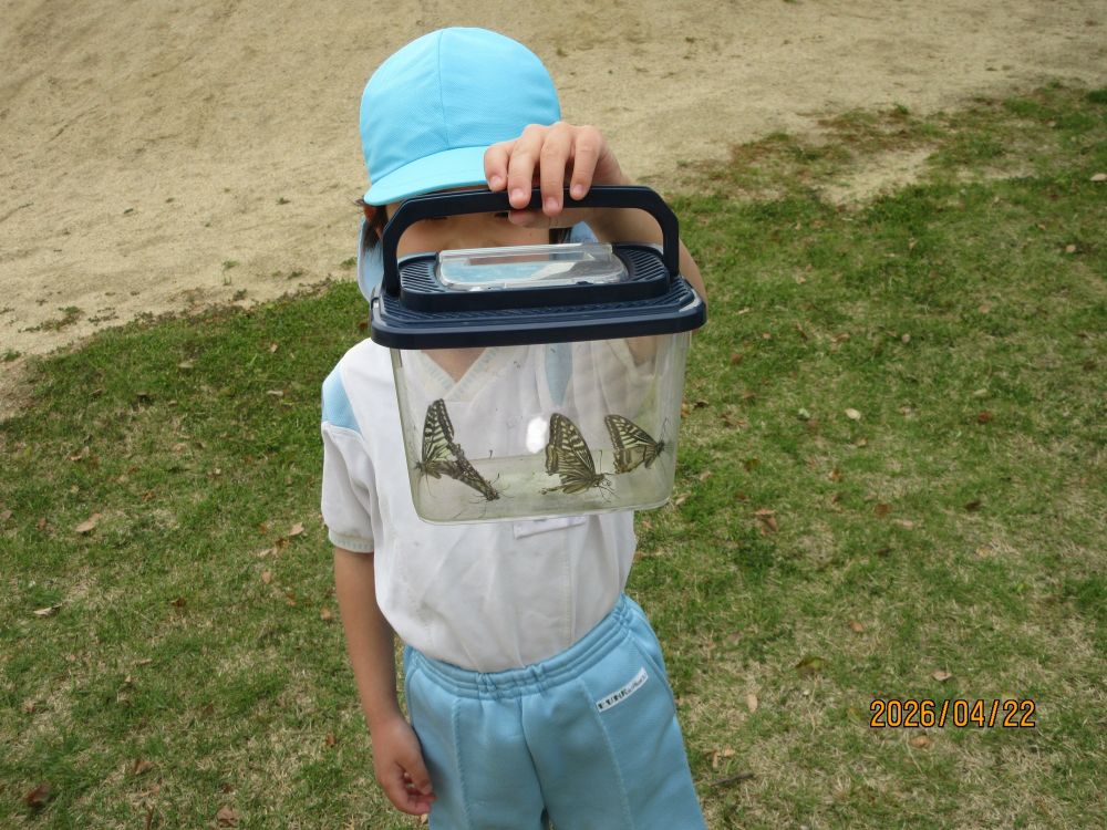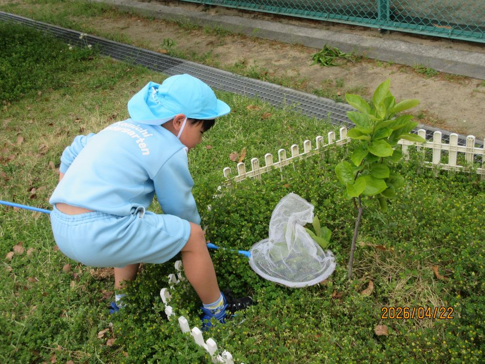 この季節は、ダンゴムシやテントウムシ、アゲハチョウ等子ども達の大好きな虫がいっぱいです。今日は、年長さんが虫捕り網を持ってアゲハチョウを追いかけていました。