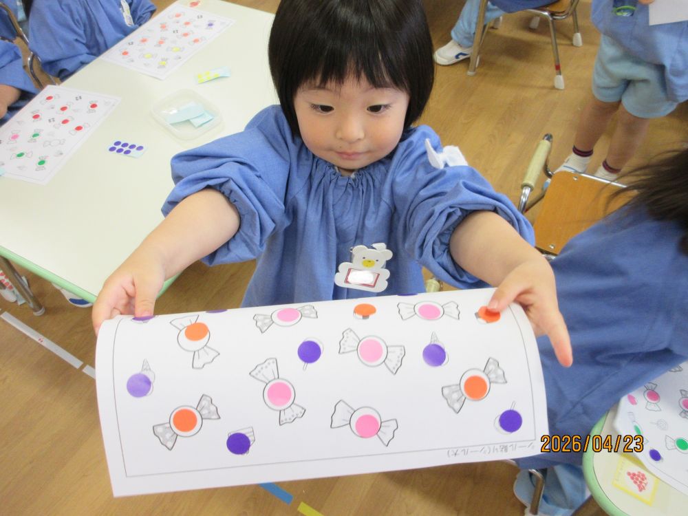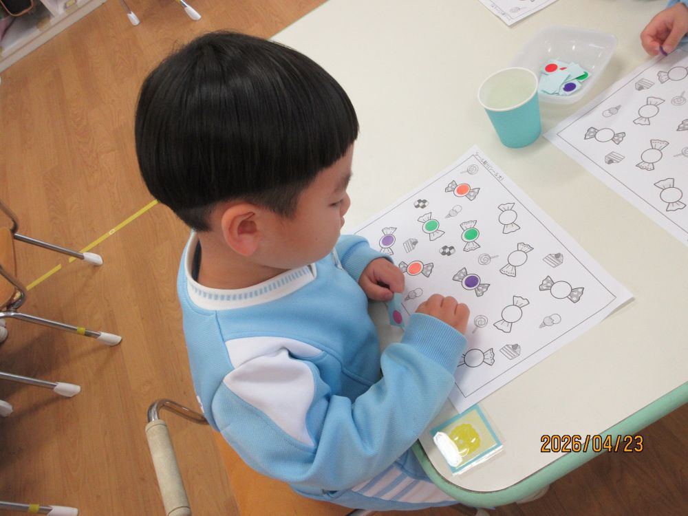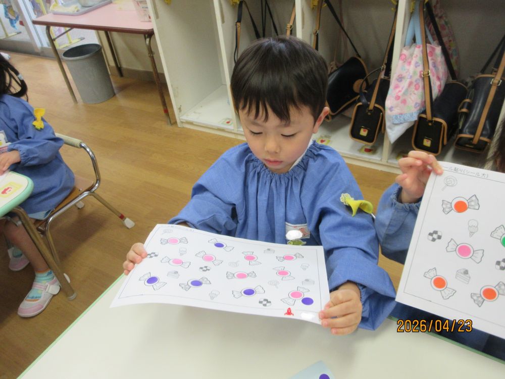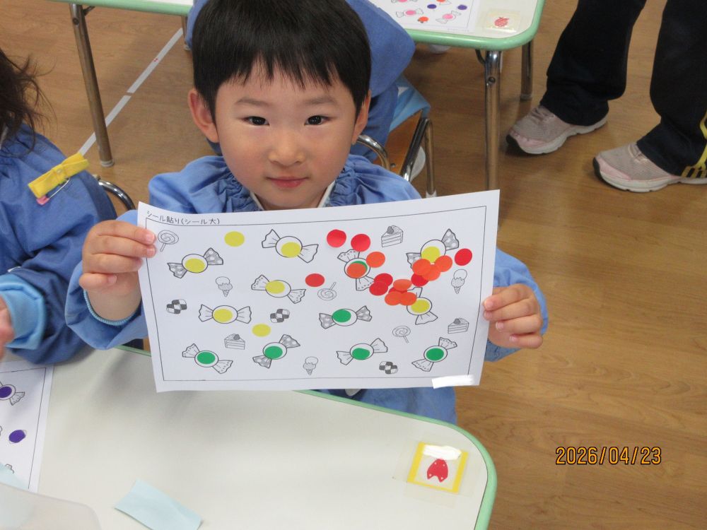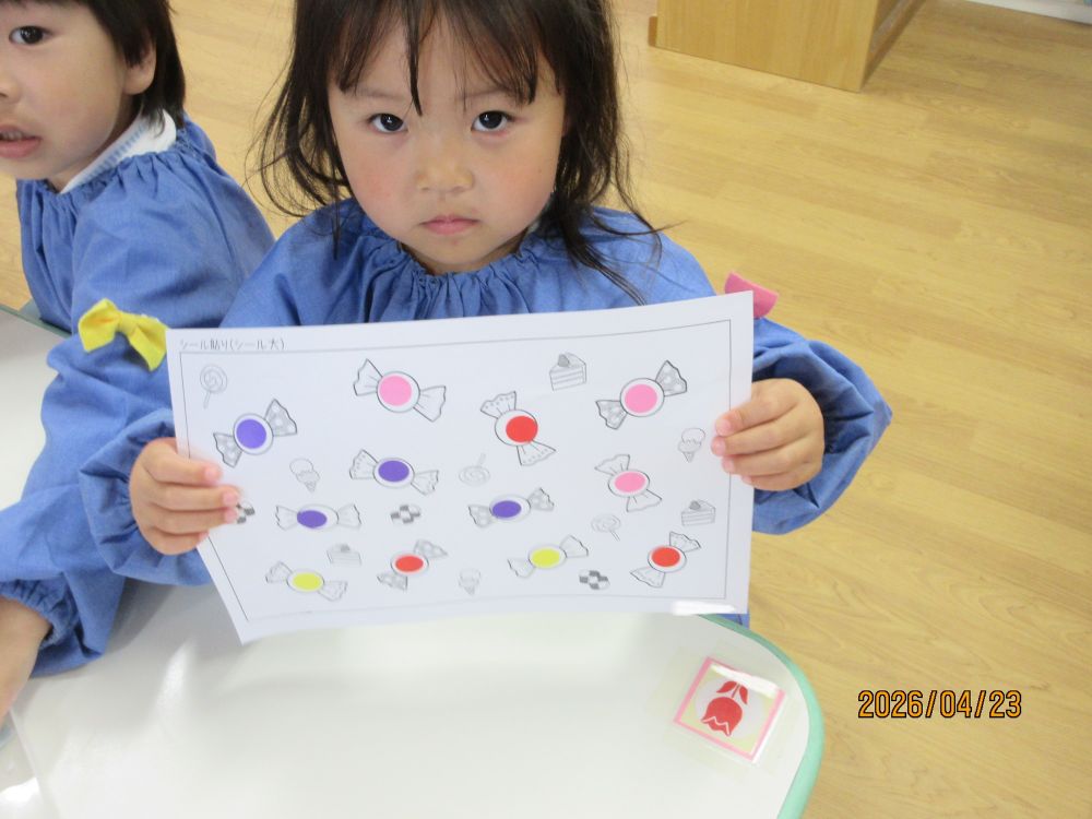 今日は朝から雨・雨・雨・・・「おそとであそべないね~。」と残念そうにつぶやく子ども達に、「お部屋で楽しいことしようね。」と言うと、「なにをしよっかな~?」とワクワクに変わりました。年少さんは、キャンディー屋さん!丸いシールを枠の中に丁寧に貼りましたよ。「これはぶどうあじ!」「あかはりんご!」と口々に教えてくれました。