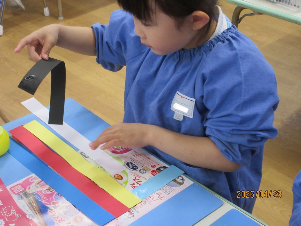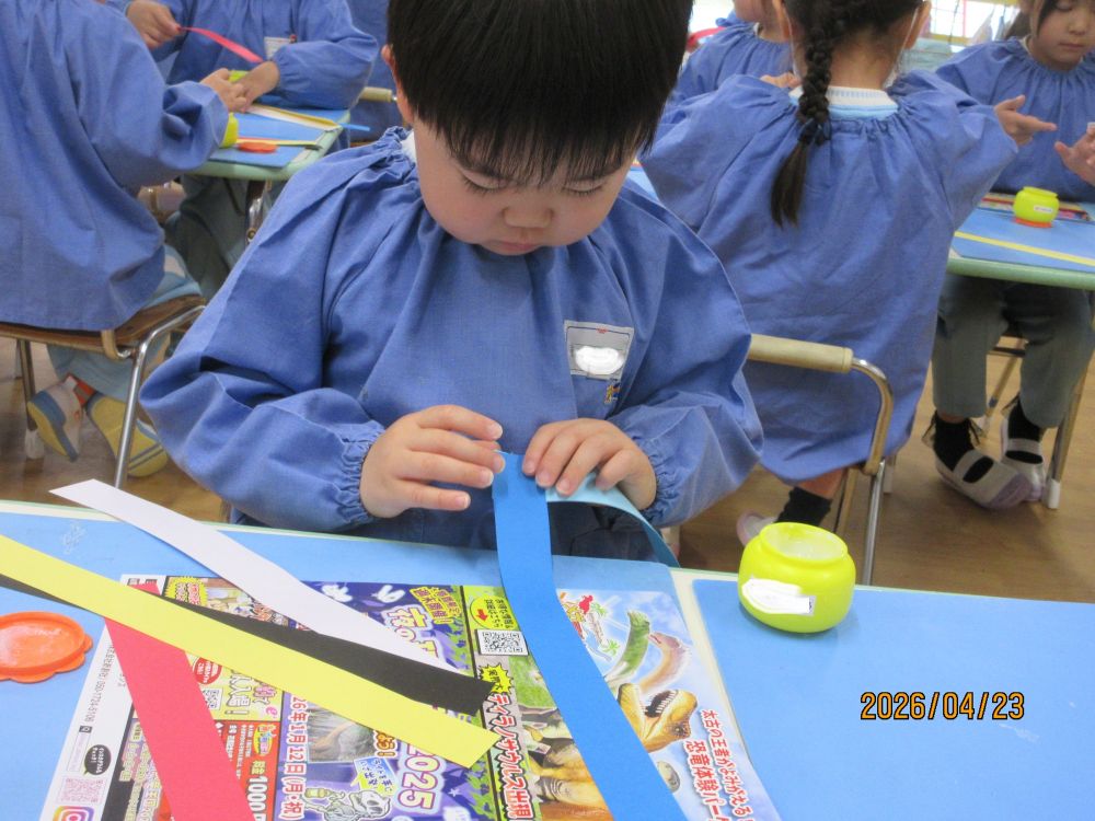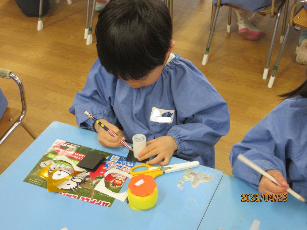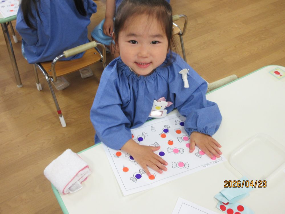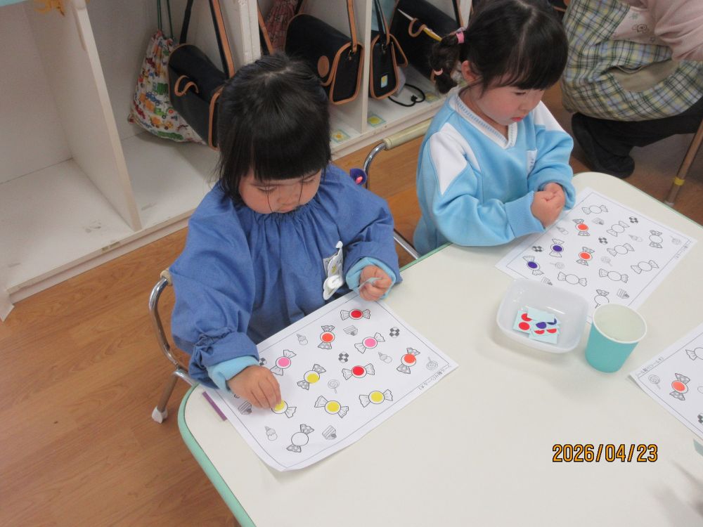 今日は朝から雨・雨・雨・・・「おそとであそべないね~。」と残念そうにつぶやく子ども達に、「お部屋で楽しいことしようね。」と言うと、「なにをしよっかな~?」とワクワクに変わりました。年少さんは、キャンディー屋さん!丸いシールを枠の中に丁寧に貼りましたよ。「これはぶどうあじ!」「あかはりんご!」と口々に教えてくれました。