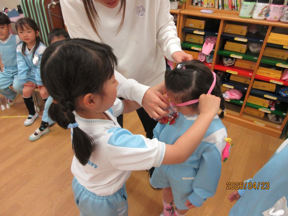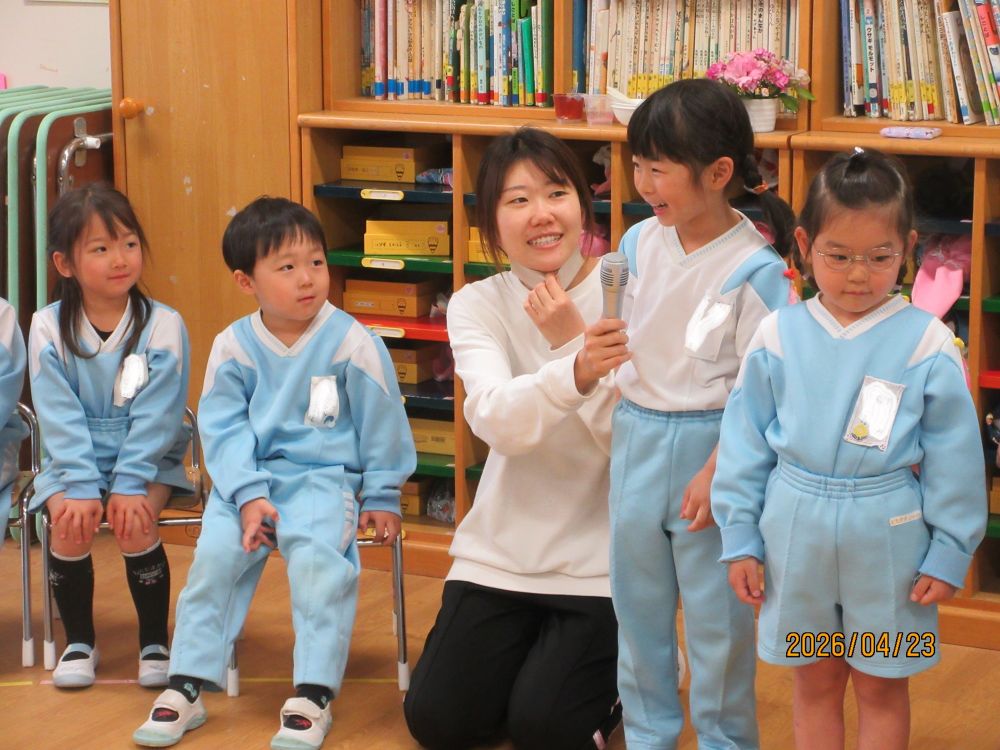年中さんの保育室では4月の誕生会をしました。誕生児に色々なインタビューをします。「すきなたべものは?」の質問に「たまごかけごはん!!」聞きたいことがいっぱい!!次々に質問が飛び出しました。少し恥ずかしそうにしながらも、しっかりと答えていましたよ。最後は、プレゼントを首からかけてもらいました。