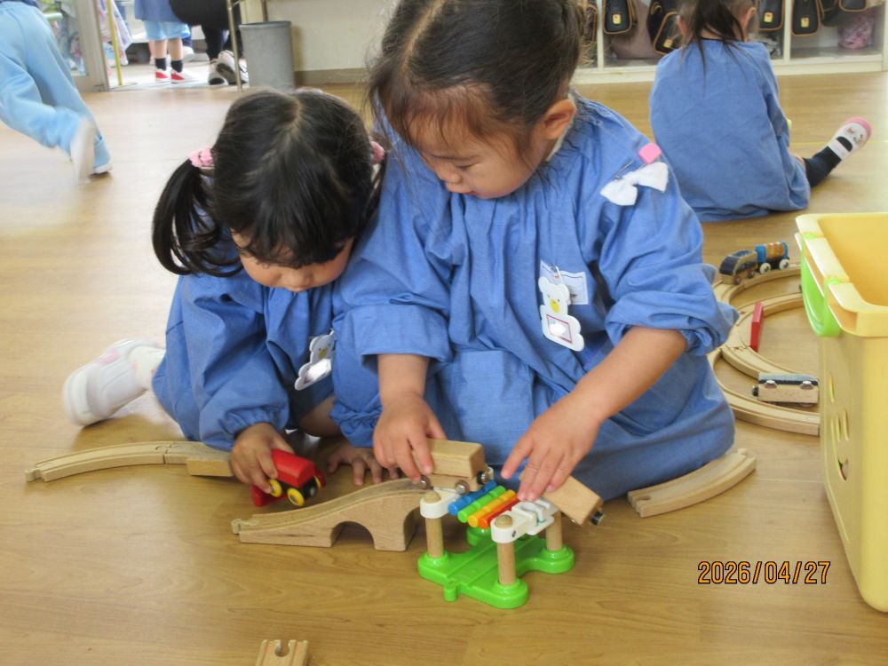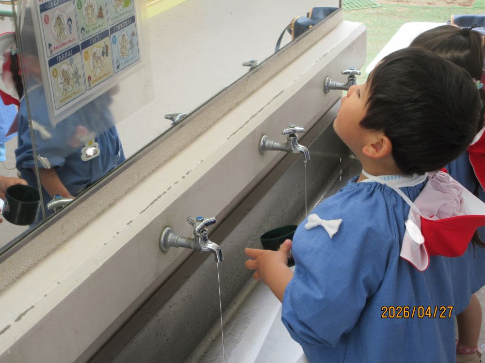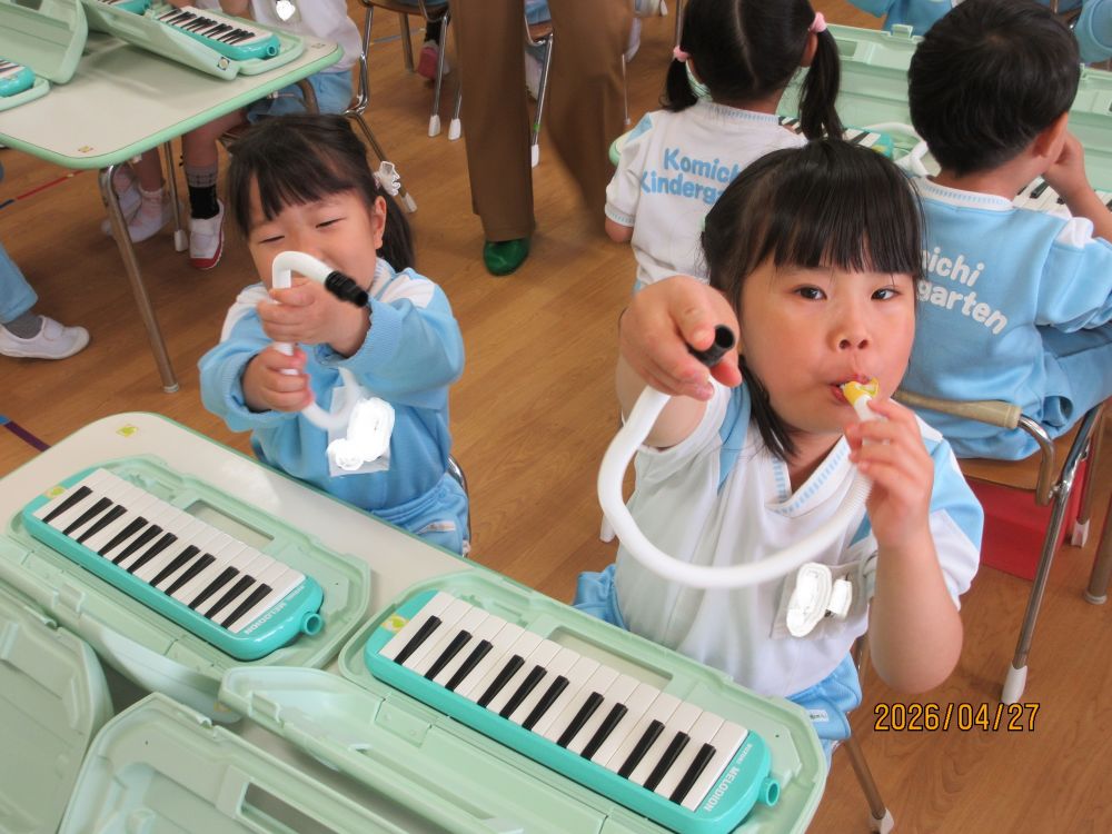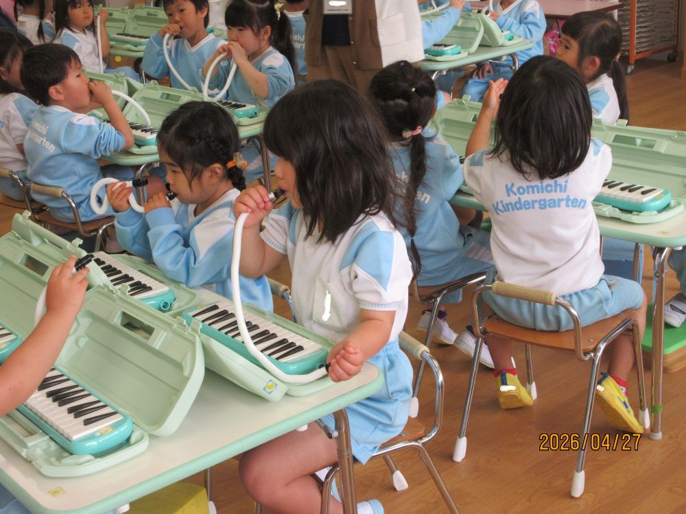 今日は年中さんになって初めての音楽指導日でした。鍵盤ハーモニカの扱い方について話を聞きました。ホースの吹き口から息を「ふ~」っとすると反対側から息が出てくることに、保育者が手をあてて「わ~っ」と驚いた様子を見せると、次々に子ども達が「ふ~」とやってきました。