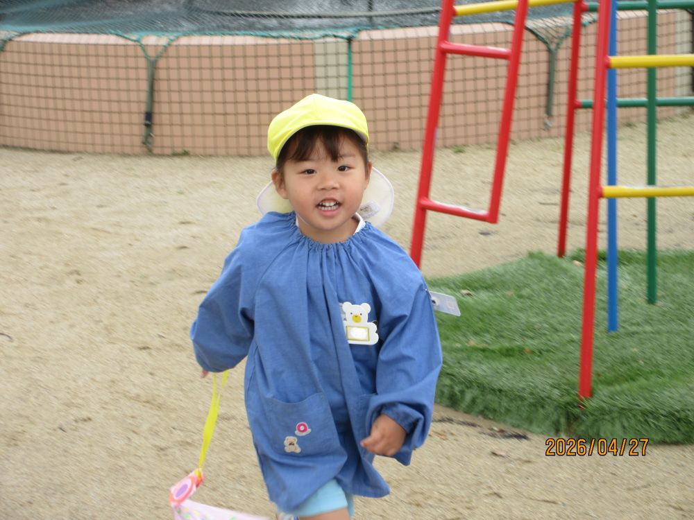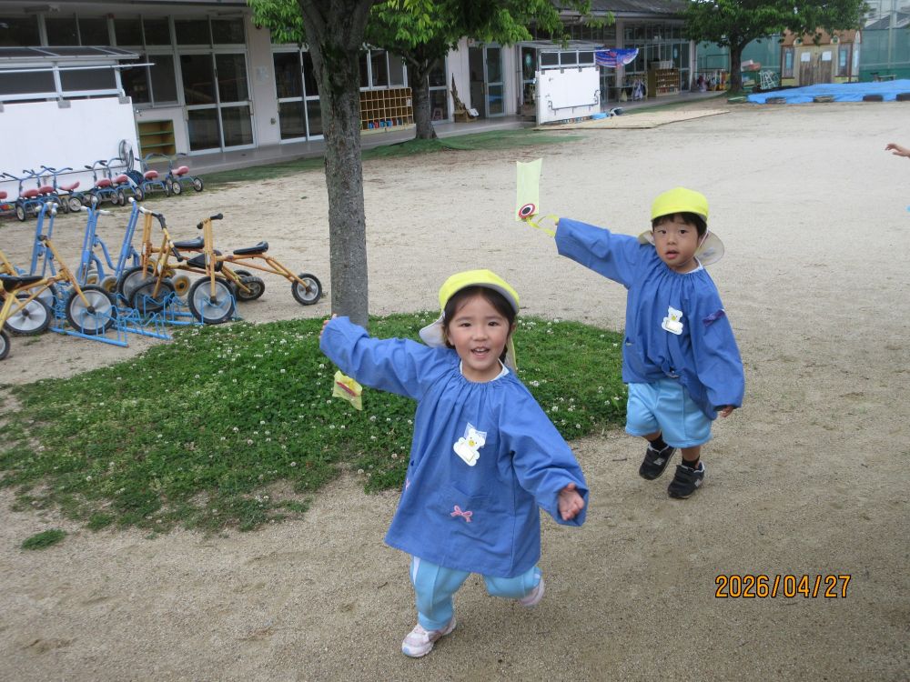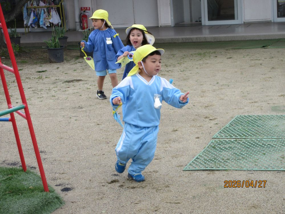 年少さんは作ったこいのぼりをもって園庭に出ました。走ると、「せんせい こいのぼりがおよいでるよ~」