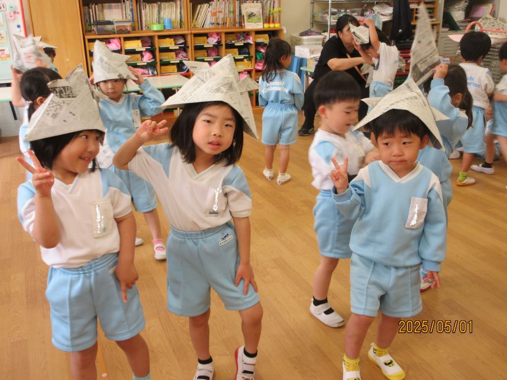 今日は全園児で「こどもの日」の集いを行いました。年長の子ども達が年少さんや年中さんの保育室まで子ども達を迎えに行き、しっかりと手をつないで、遊戯室に集合しました。遊戯室では、「こどもの日」の由来や、各年齢ごとの製作物について話を聞きました。そして、ビッグこいのぼりの登場に子ども達も「わ~!!」と大歓声があがっていました。保育室に戻って、年長さんからのプレゼントが!!!年少さんには、かぶとのペンダント、そして年中さんには新聞紙で折ったかぶとがプレゼントされました。