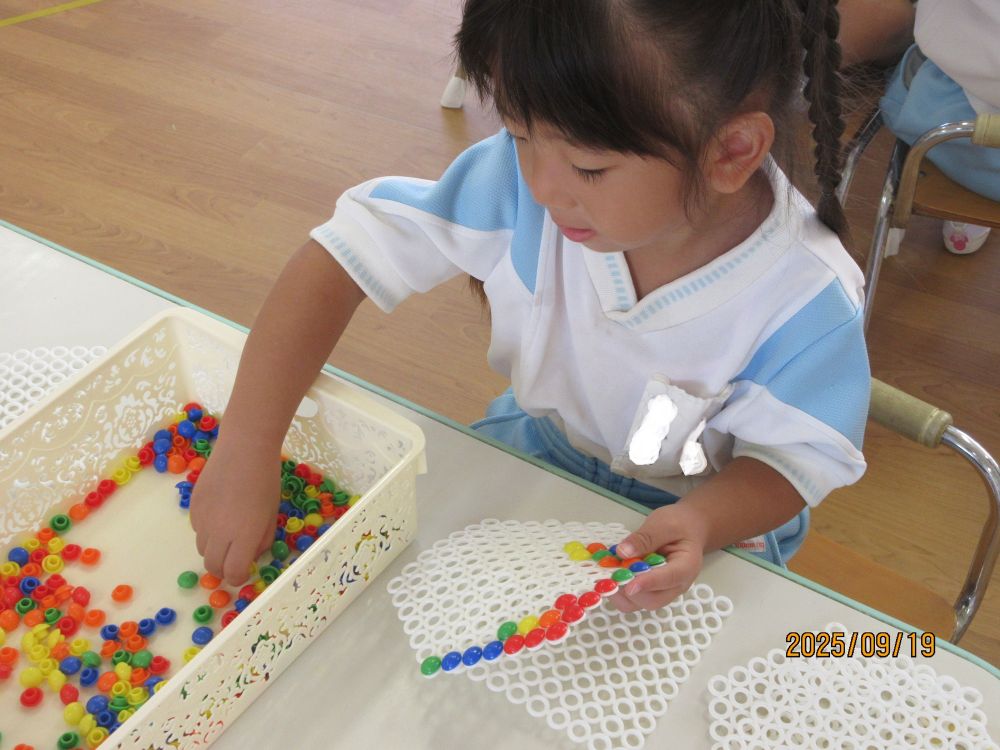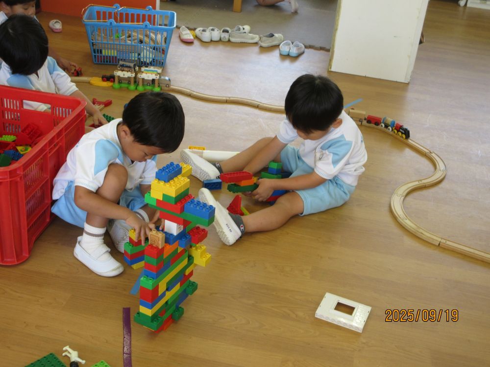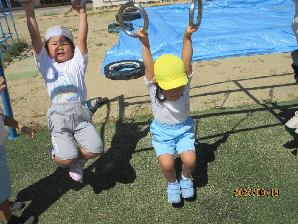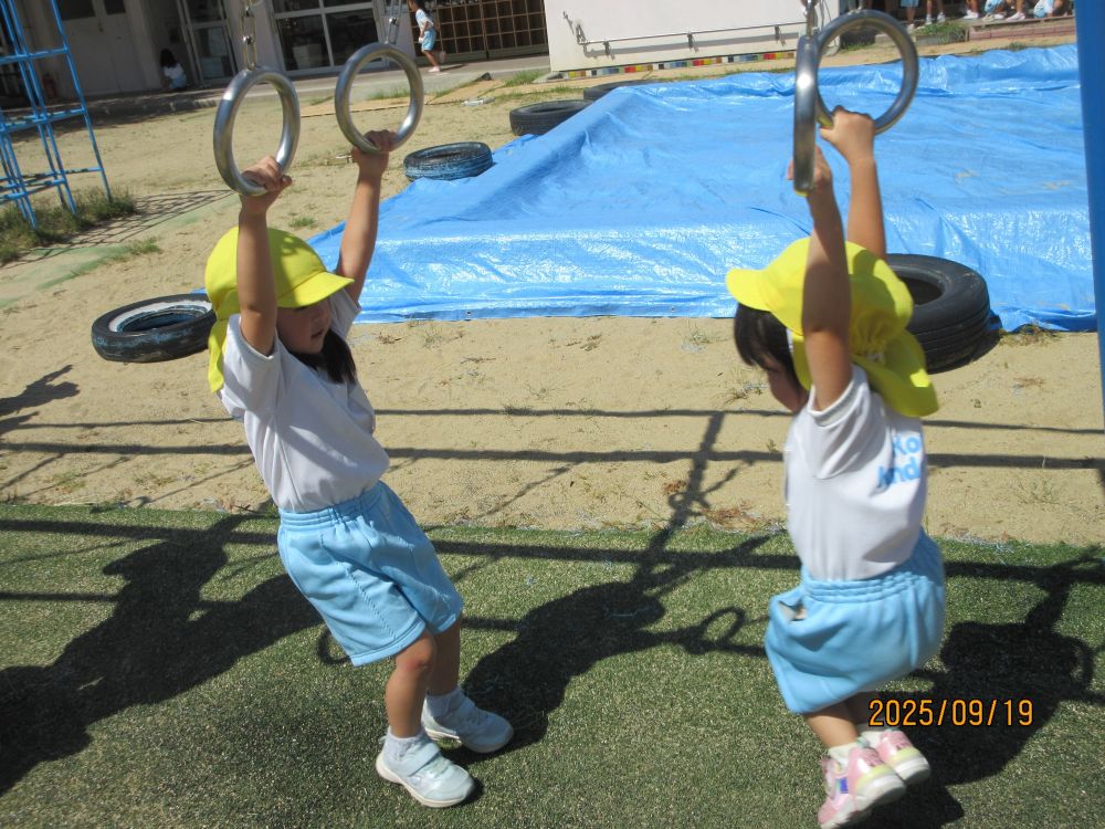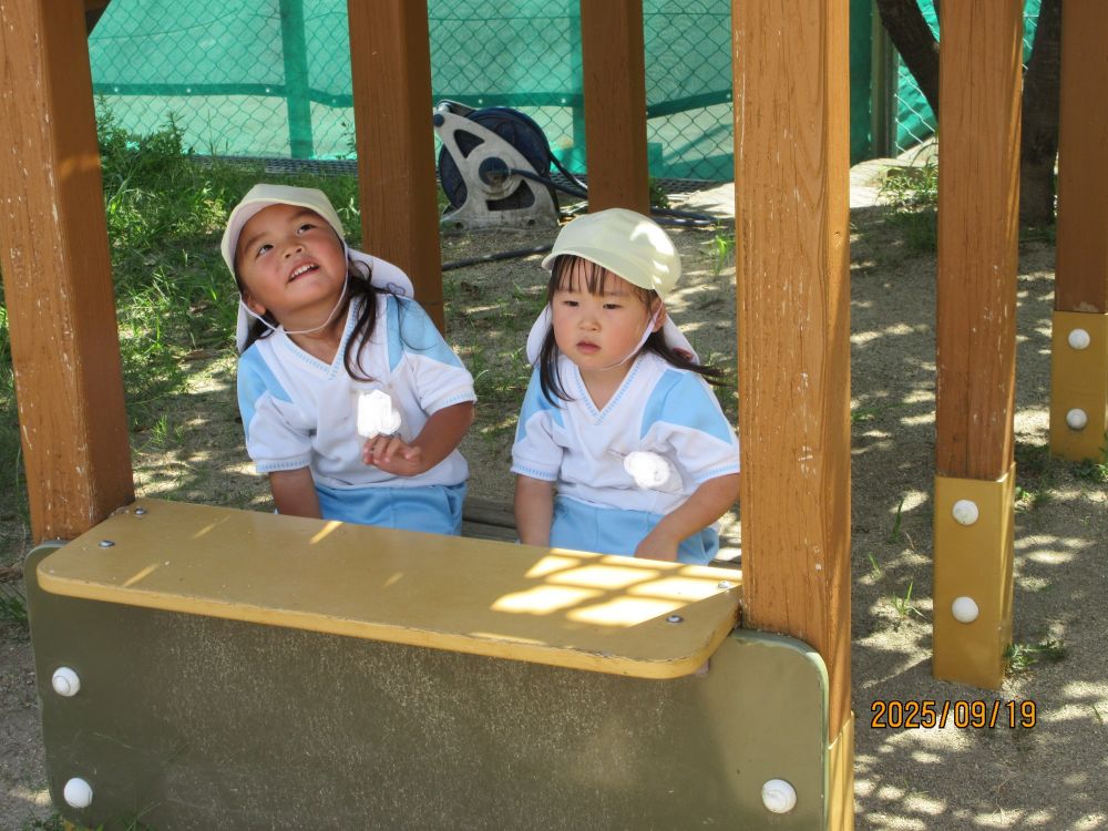 今日は比較的涼しく過ごしやすい一日でした。朝から全園児が集まって「ダンスホール」をしました。年長さんの「せんせい」を見ながら子ども達は一生懸命踊っていました。