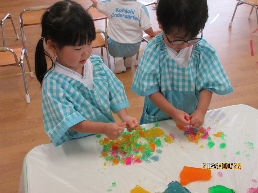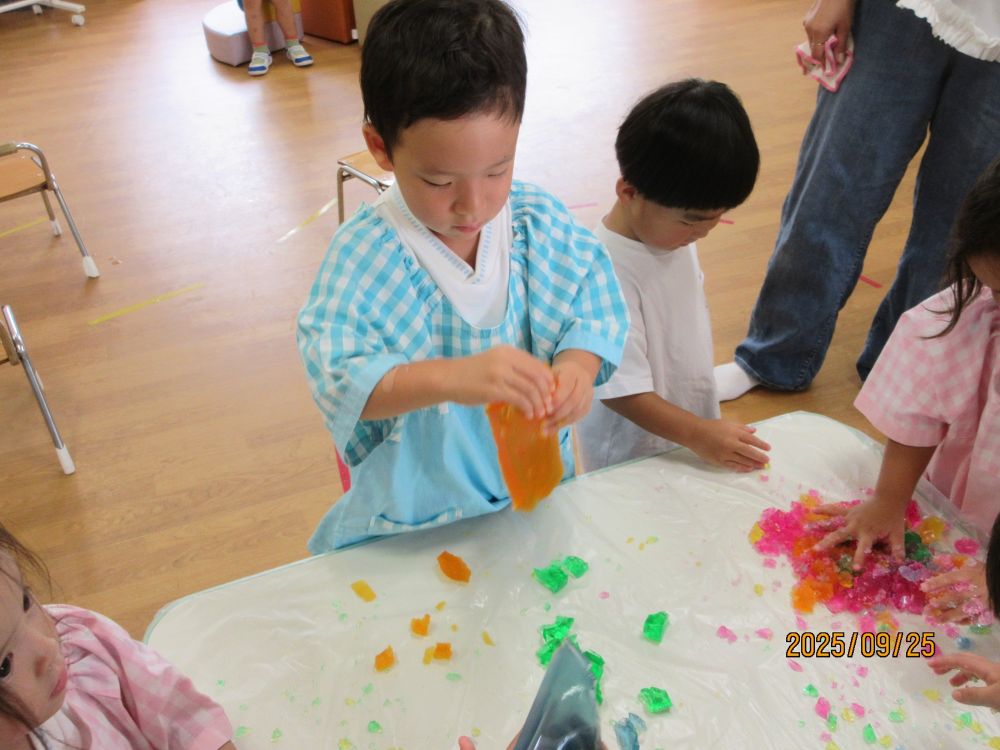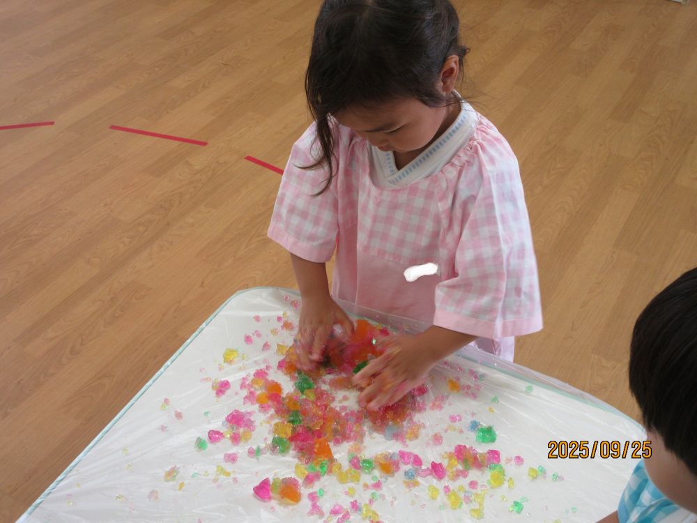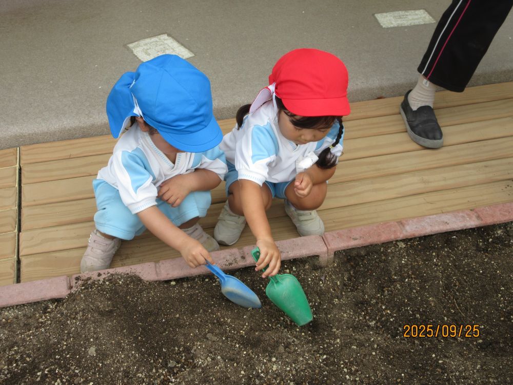 年少さんがミニ畑を一生懸命スコップで耕していました。栄養満点の新しい土を混ぜ込んでフワフワの土に仕上げました。「ラディッシュ」の種を蒔きますよ。収穫が楽しみですね。