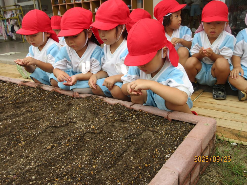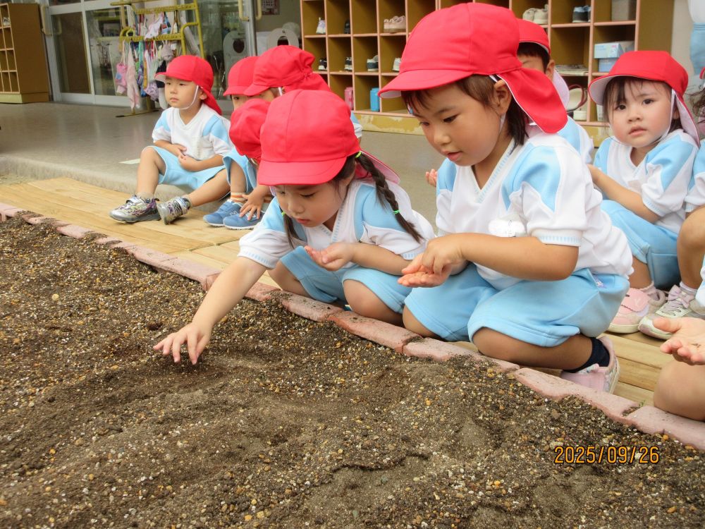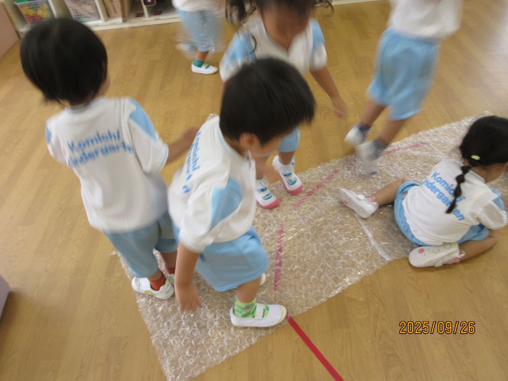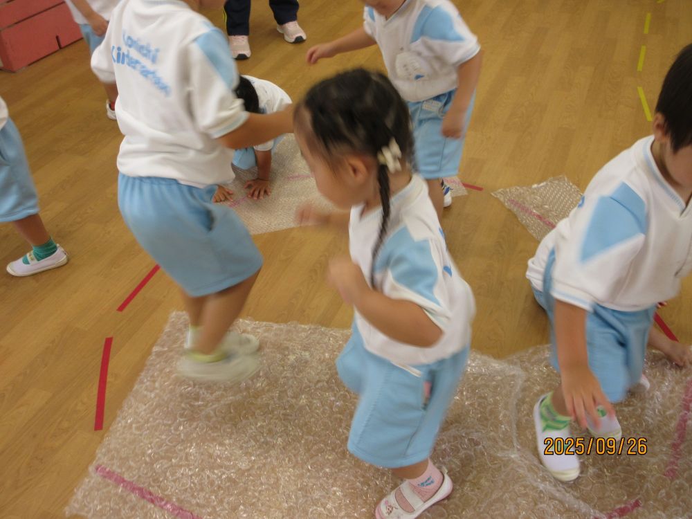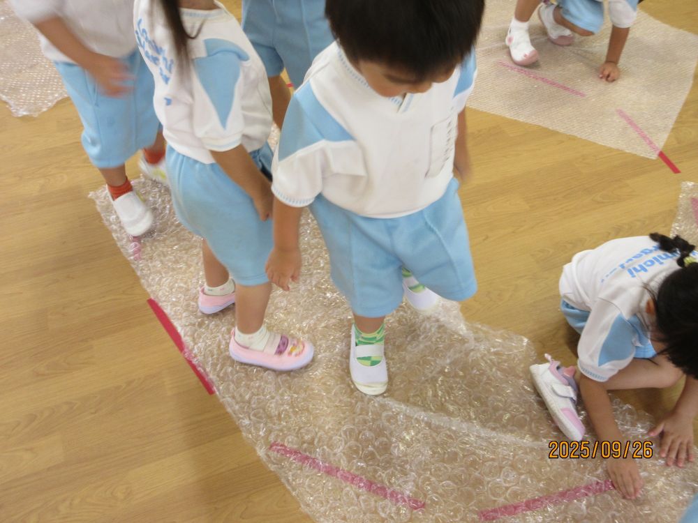 荷物の梱包に使用されるプチプチがたくさんあったので、保育室に持って行きました。指で潰すと音がすることに子ども達も興味津々!挑戦するにも、うまく音が鳴りません。そこで、子ども達はジャンプジャンプ!!すると、驚くほど大きな「パ~ン!!」という音が・・・びっくりするのと同時に楽しくなってジャンプジャンプ!!!「パン」「パパン」「パン」と保育室の中が大賑わいです。慌てて他の保育室から先生が「びっくりした~何の音かと思った~」ととんでこられました。